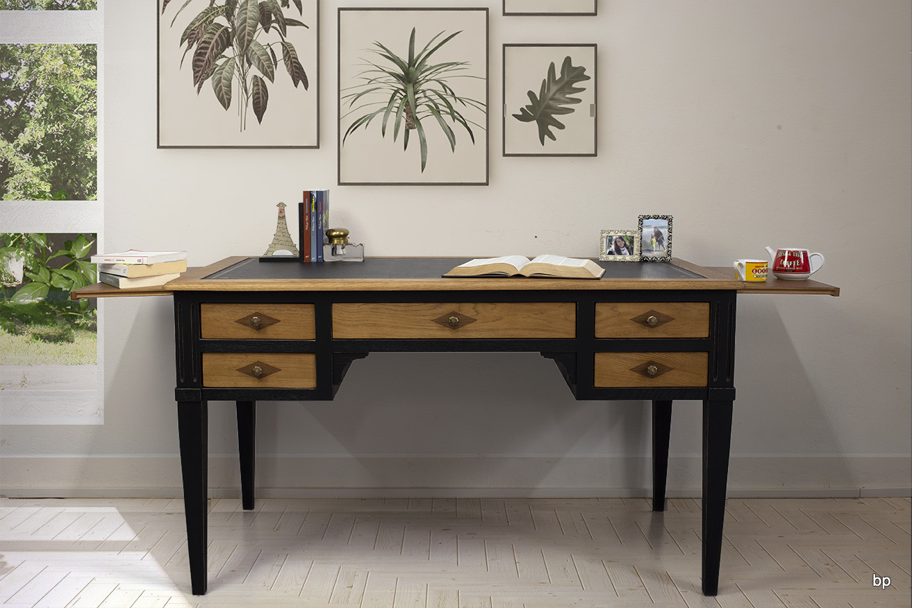 Su acabado es negro ligeramente envejecido, la bandeja y sus cajones en roble dorado , (finalizado siempre con un lustrado manual), existiendo diferentes colores de acabado, no dude en pedir nuestras muestras de color de manera gratuita.