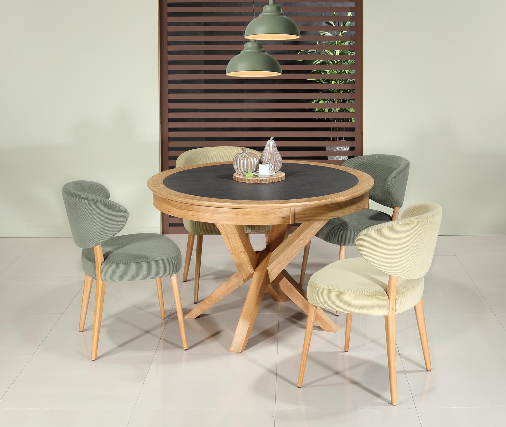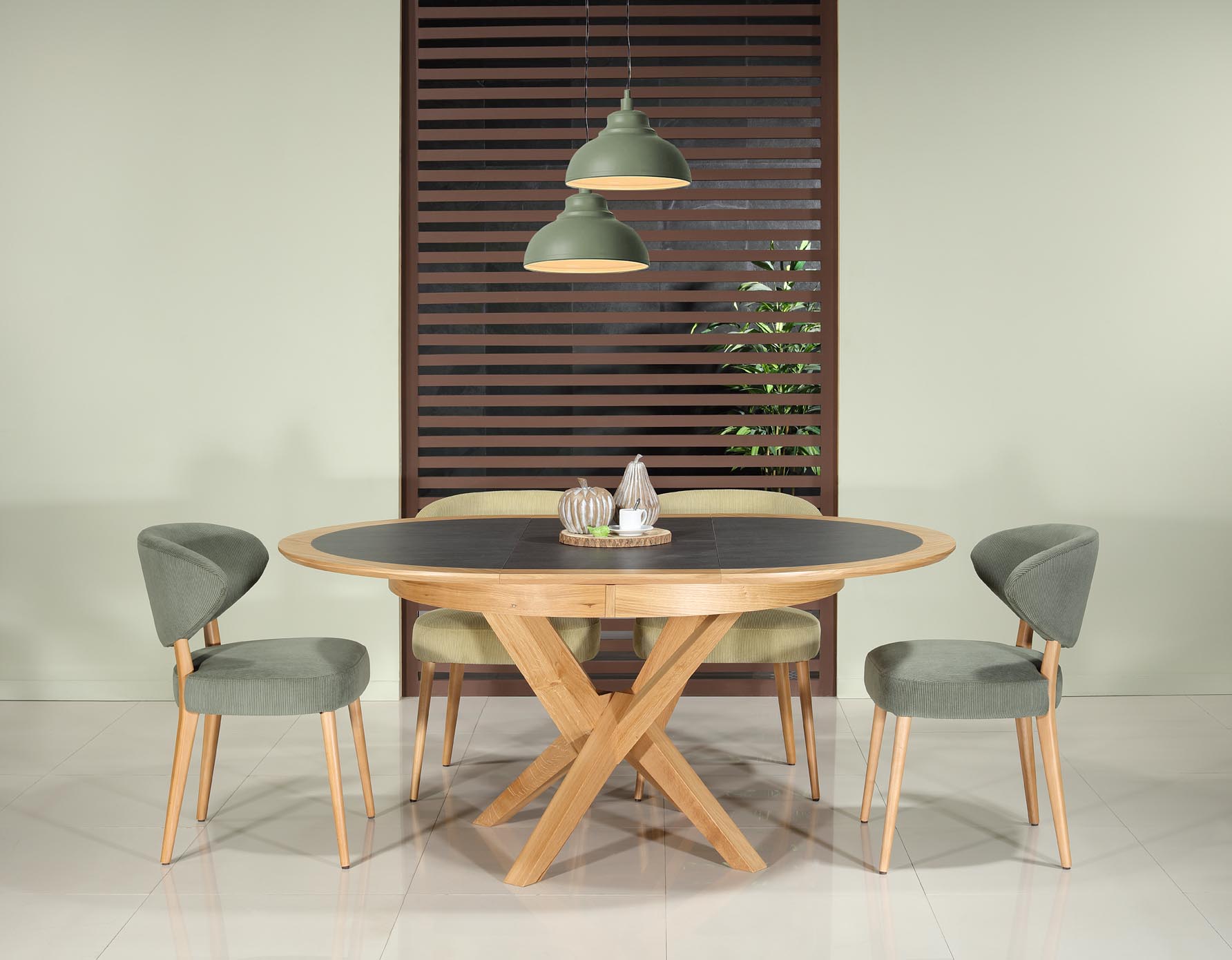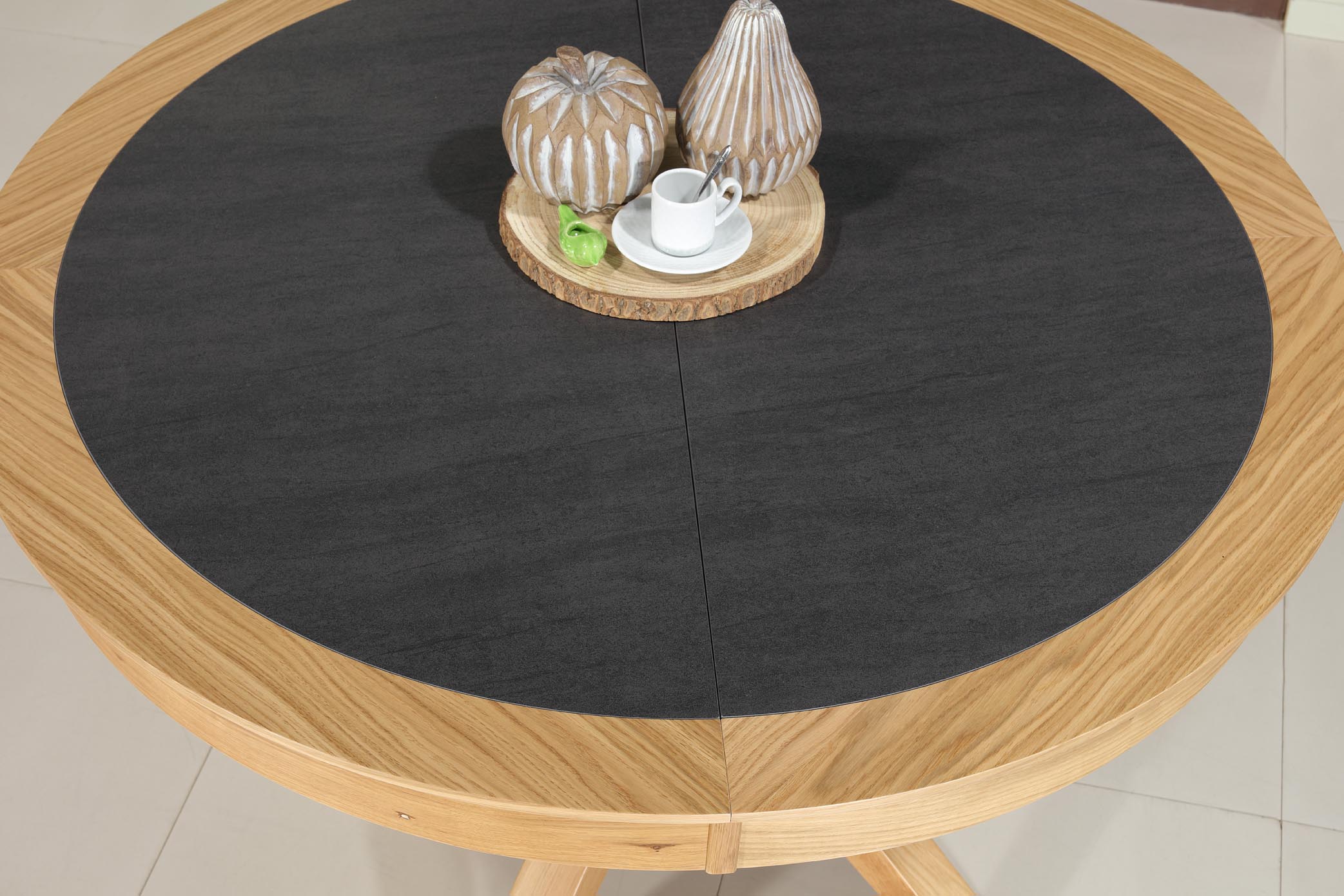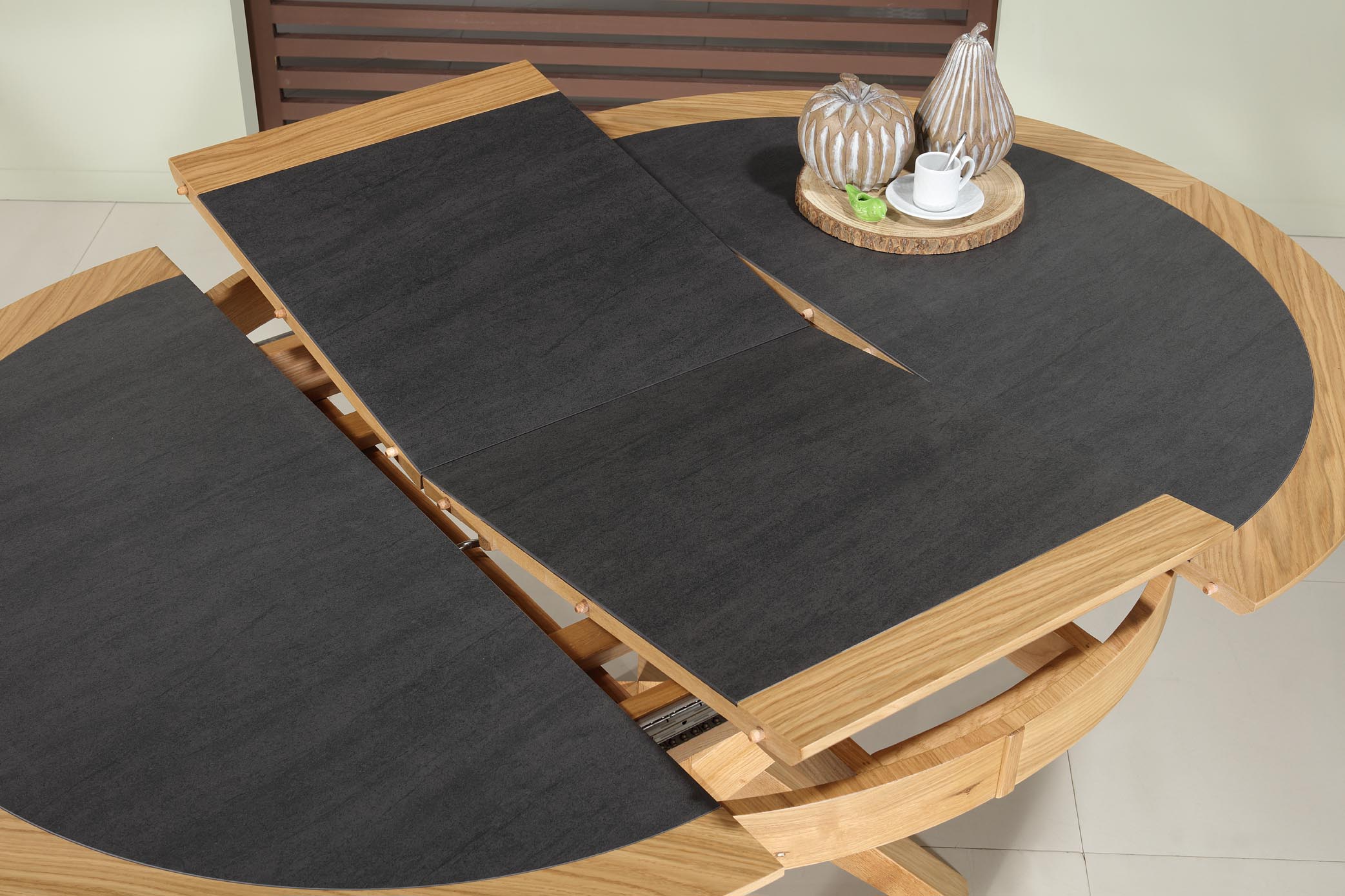 • Incrustación de Cerámica Negra Basalto integrada con elegancia en el tablero y la extensión, realzando la sofisticación de la mesa