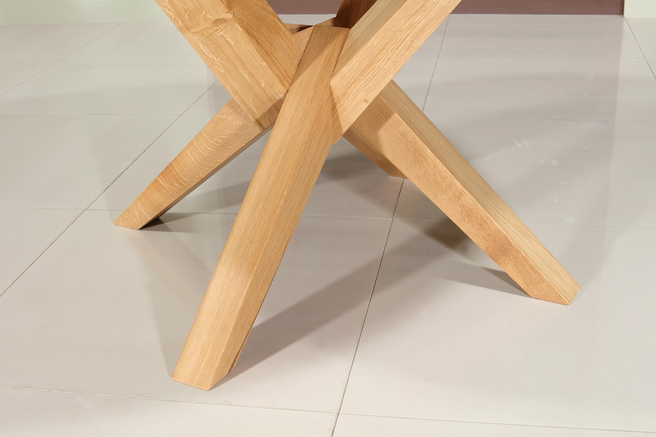 • Pedestal Central Único diseñado con múltiples segmentos de madera dispuestos de manera armónica, añadiendo un toque atractivo a la mesa